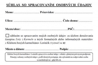 Prosíme Vás o súhlas so spracovaním osobných údajov za účelom doručovania časopisu Listy z Karmelu a iných ...