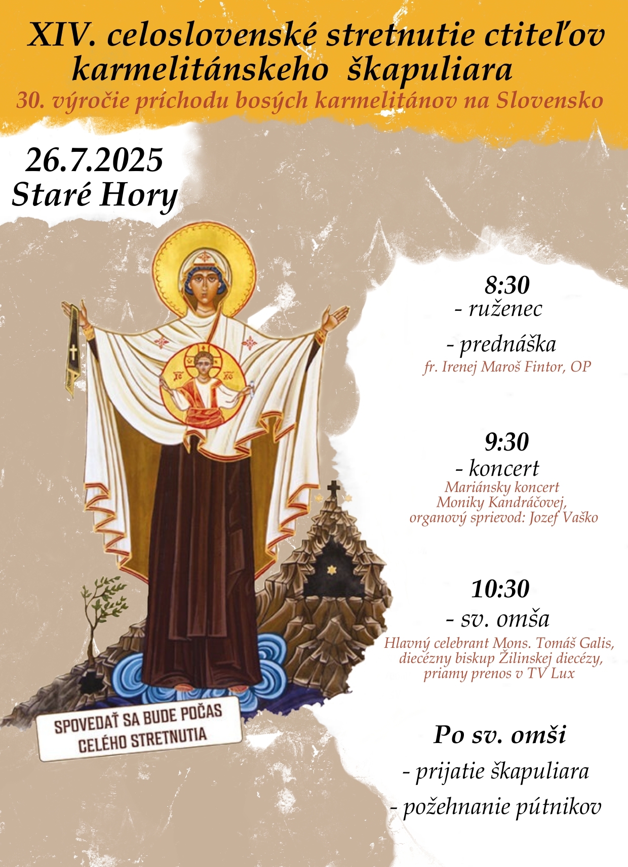 Srdečne vás pozývame na XIV. celoslovenské stretnutie ctiteľov karmelitánskeho škapuliara a Panny Márie Karmelskej, ktoré sa uskutoční na budúcu sobotu 26. júla v mariánskom pútnickom mieste na Starých Horách pri Banskej Bystrici. Na tomto stretnutí budeme dobrému Bohu ďakovať aj za 30 rokov od príchodu bosých karmelitánov na Slovensko.