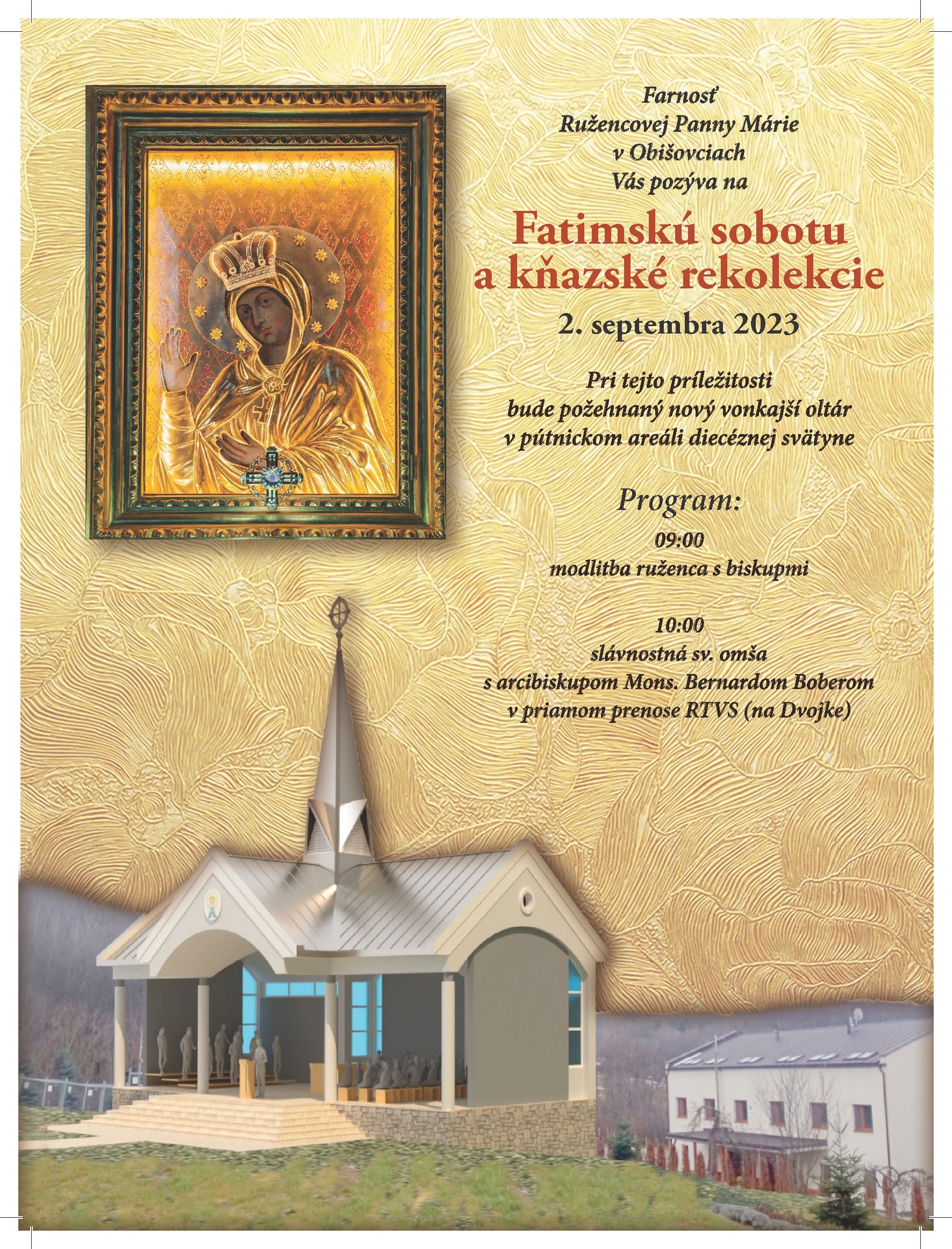 Farnosť Ružencovej Panny Márie v Obišovciach pozýva na Fatimskú sobotu a kňazské rekolekcie 2. septembra 2023. Pri tejto príležitosti bude požehnaný nový vonkajší oltár v pútnickom areáli diecéznej svätyne. V programe je od 09.00 hod. modlitba ruženca s otcami biskupmi a o 10.00 hod. slávnostná sv. omša s o. arcibiskupom Mons. Bernardom Boberom, ktorú bude vysielať aj RTVS na Dvojke.