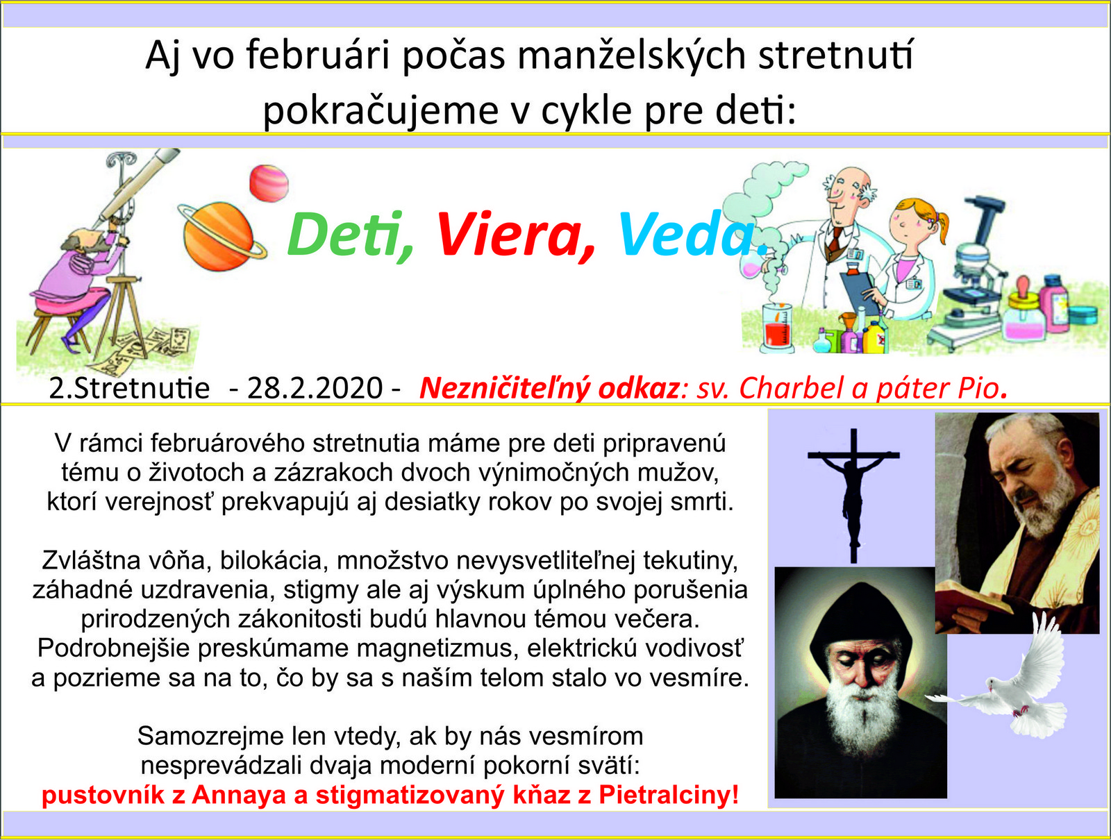 Aj počas februárového stretnutia manželov pokračujeme v cykle pre deti: „Deti, Viera, Veda“, preto aj teraz špeciálne pozývame všetky deti. Máme pre ne pripravenú tému o životoch a zázrakoch dvoch výnimočných mužov, ktorí verejnosť prekvapujú aj desiatky rokov po svojej smrti. Zvláštna vôňa, bilokácia, množstvo nevysvetliteľnej tekutiny, záhadné uzdravenia, stigmy ale aj výskum úplného porušenia prirodzených zákonitostí budú hlavnou témou večera. Podrobnejšie preskúmame magnetizmus, elektrickú vodivosť a pozrieme sa na to, čo by sa s naším telom stalo vo vesmíre. Samozrejme len vtedy, ak by nás vesmírom nesprevádzali dvaja moderní pokorní svätí: pustovník z Annaya a stigmatizovaný kňaz z Pietrelciny! Viac informácií nájdete na výveske vo vestibule.