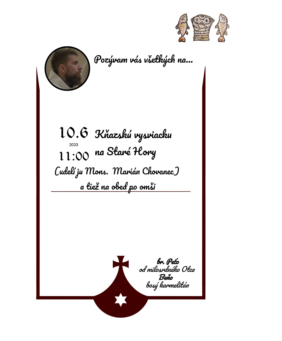 Brat diakon Peter Beňo nás pozýva na kňazskú vysviacku, ktorú mu udelí Mons. Marián Chovanec, banskobystrický biskup, v sobotu 10. júna 2023 o 11.00 hod na Starých Horách.